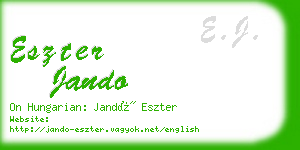 Frequency of ESZTER name and JANDO surname in HungaryThe Eszter name frequency in Hungary: The name is in TOP Eightteen most common woman name in Hungary. As 1.st name: 0.6486% (Sixty-Four Thousand Eight Hundred and Fifty-Seven), as 2nd name: 0.1303% (Thirteen Thousand and Twenty-Eight) woman have this name.. Jando surname frequency: 10 What English words can be put together from characters of the name?